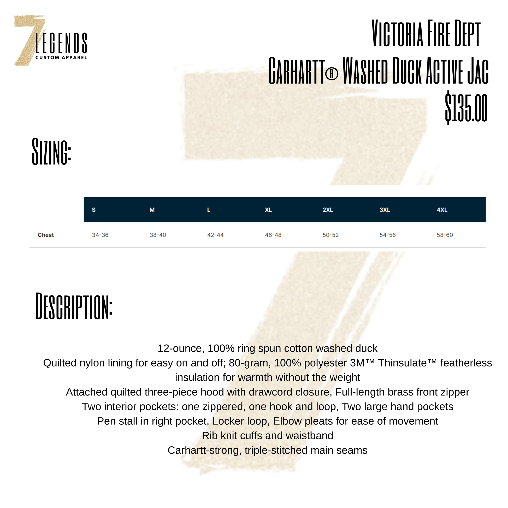 Get the best of both worlds with Carhartt's Washed Duck Active Jac! This updated version of the iconic J130 jacket is designed with feedback from hardworking individuals in mind. Made with 12-ounce cotton washed duck, it features a quilted nylon lining for easy on and off, and 3M™ Thinsulate™ insulation for warmth without the weight. The attached three-piece hood and brass zipper add functionality, while the interior and hand pockets provide ample storage. Plus, the elbow pleats and embroidered Victoria Fire Department logo make it both practical and stylish. (Firefighters can finally stay warm and look cool!). Want it personalized? *Add the last name/personalization details to the notes section.